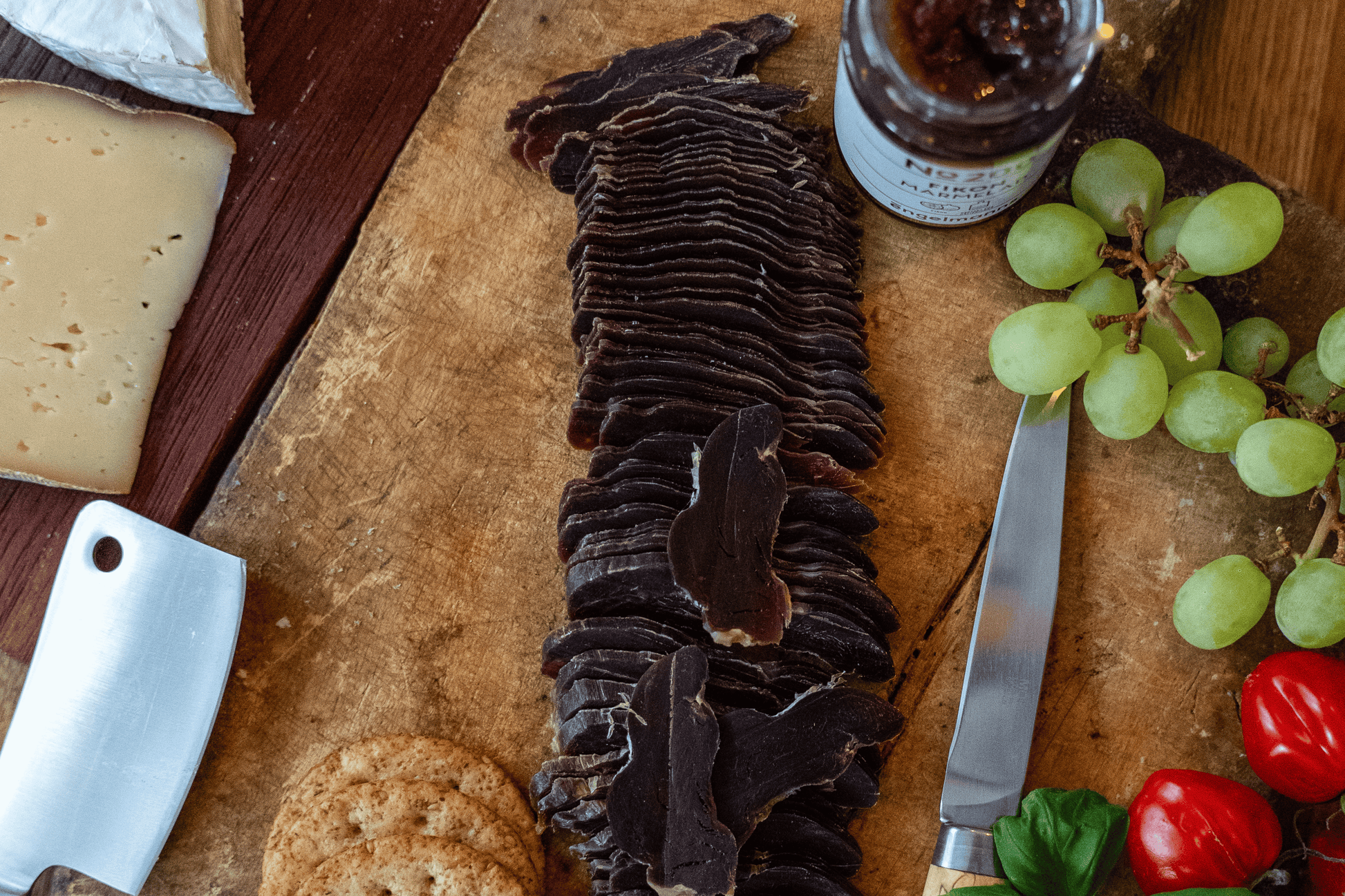 Älgsteken är rimmad i ett dygn och sedan lufttorkad utomhus i ren fjäll luft i flera veckor. Torked älgstek är utmärkt att ta med på utflykt eller som tilltugg.